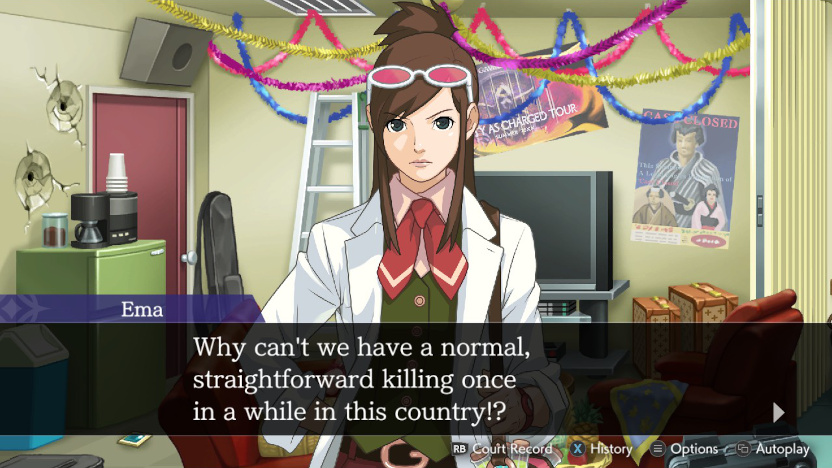 In the original trilogy, Phoenix received the Magatama by game 2 as a way to inject a bit of the evidence-driven deduction-making gameplay into the slower-paced clue-finding phase, and this was good. But because our protagonists need equivalent special gameplay-altering abilities now I guess, in Apollo Justice, Apollo just shows up on his first day wearing a magical bracelet that lets him easily see “tells” that indicate a witness is lying. It’s kind of justified late in the game, but before then, there is exactly zero reverence for this fascinating piece of jewelry, and it is absolutely bizarre at how little attention it receives in-universe. Also, the gameplay it adds is pretty bad; the game hyper-zooms in on the witness as they slowly repeat a statement, and during one part of that statement, one part of their body will behave differently—the “tell”. This sucks; the camera is so zoomed-in that you can only cover maybe a quarter of the witness’s body at once, and you might only have a couple seconds to drag the slow camera around and identify the tell during the few words that it’s visible. If you miss it, you have to cycle through the entire slowed-down statement again and hope you find it this time… all of which is assuming you’re examining the correct statement to begin with. I guess the developers wanted a way to be able to advance the courtroom scenes without needing evidence all the dang time, but this is such a bad solution because it’s not asking the player to challenge their assumptions (you know, the best part of the game); it’s more like an elaborate spot-the-difference puzzle.