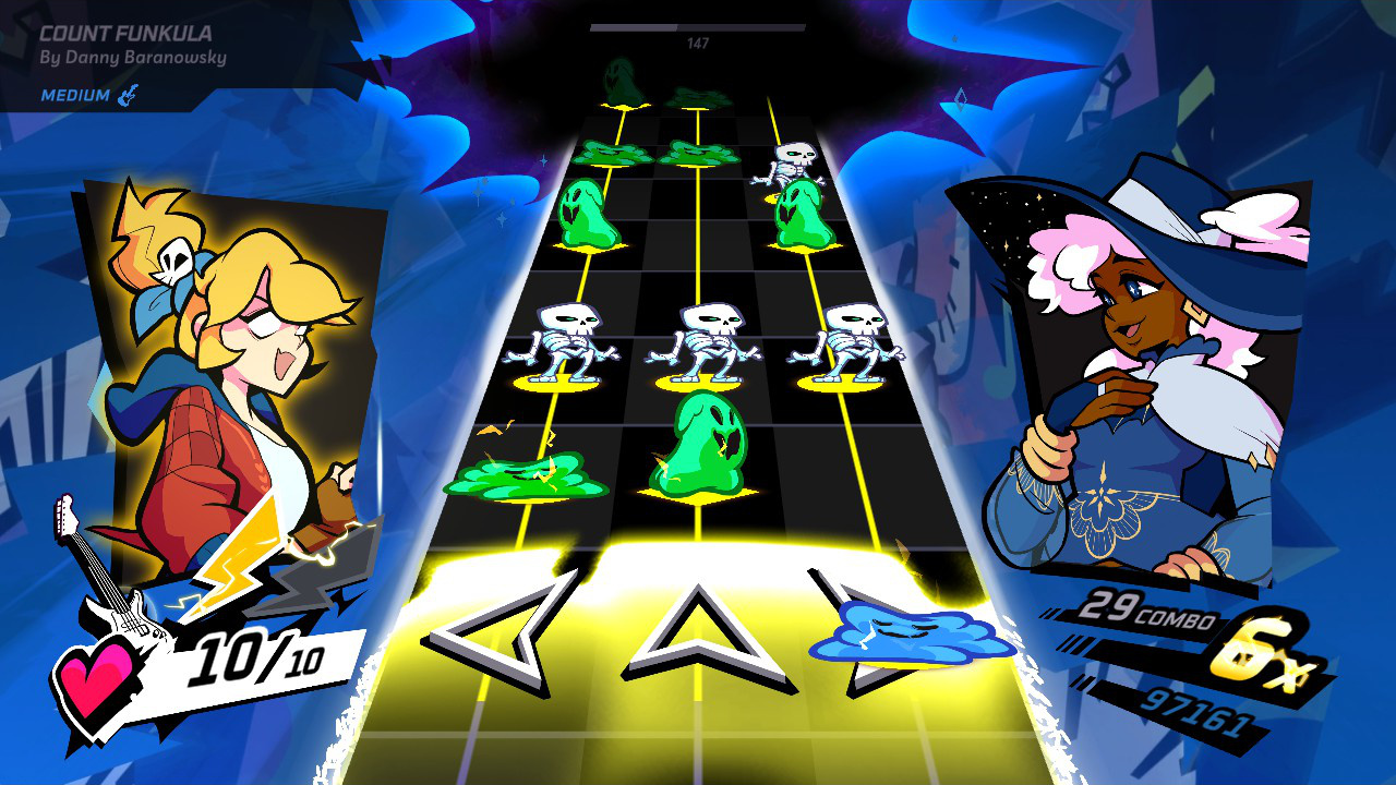 …But gosh, is it hard. It’s not as simple as just hitting the notes as they reach the bottom, because now the notes like to jump around the fretboard. You have to memorize a dozen or so different movement patterns, which are represented by the different enemy types (to say nothing of the additional effects you encounter sometimes that can alter how an enemy behaves). Even on Medium difficulty it’s so chaotic that if I’ve had a whiskey, I simply can’t play it.